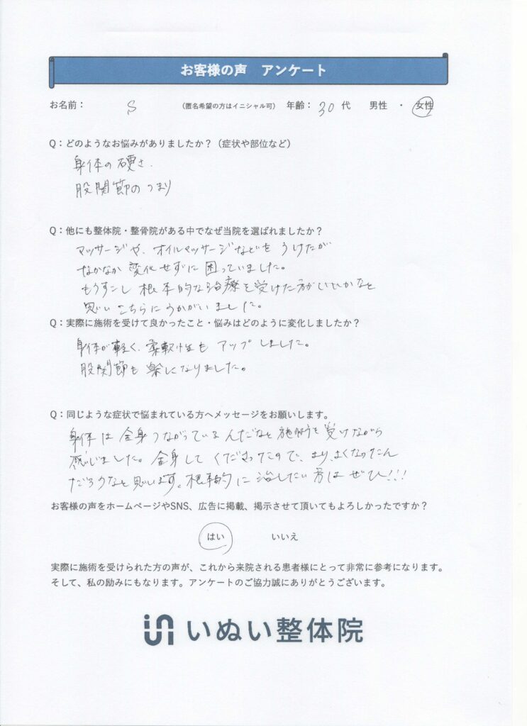 お客様の声 股関節のつまり、身体の硬さでお悩み